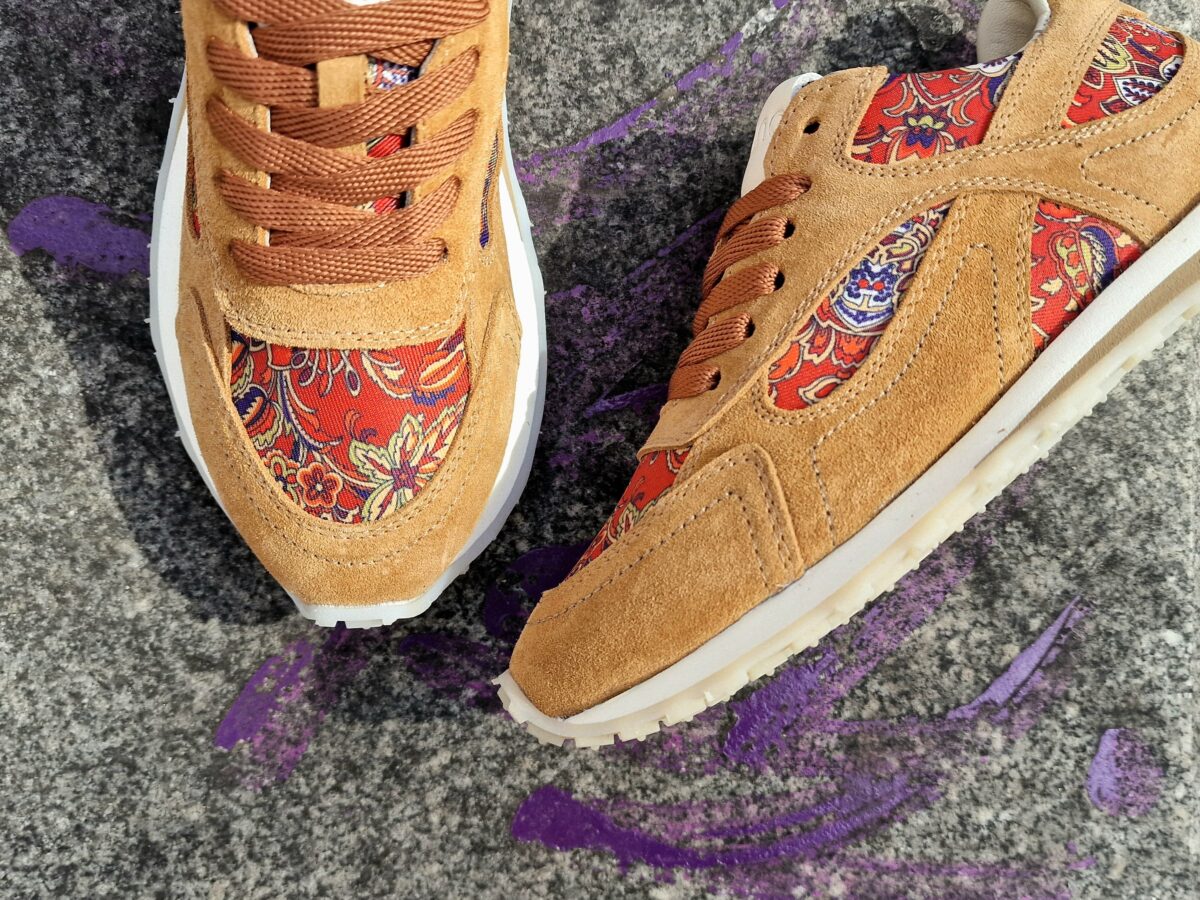 Дамски олекотени маратонки от естествен велур и текстил с цветен принт и EVA ходило