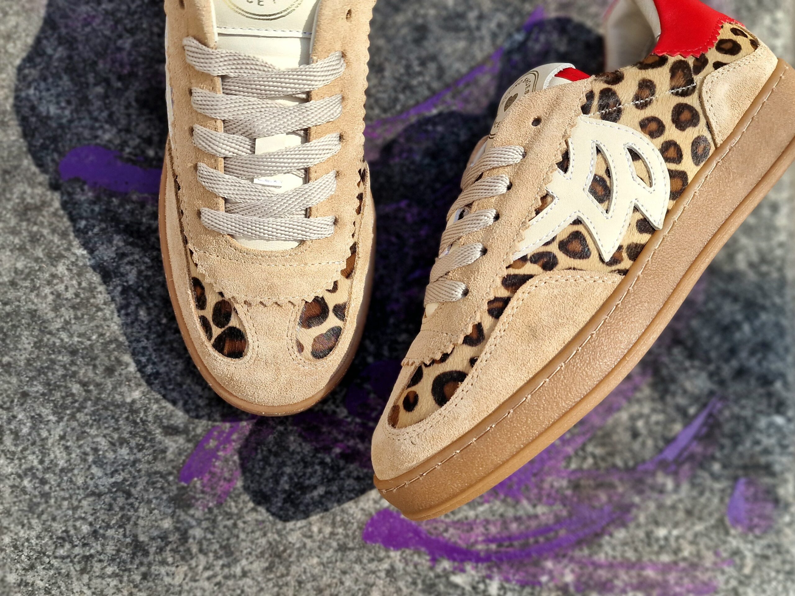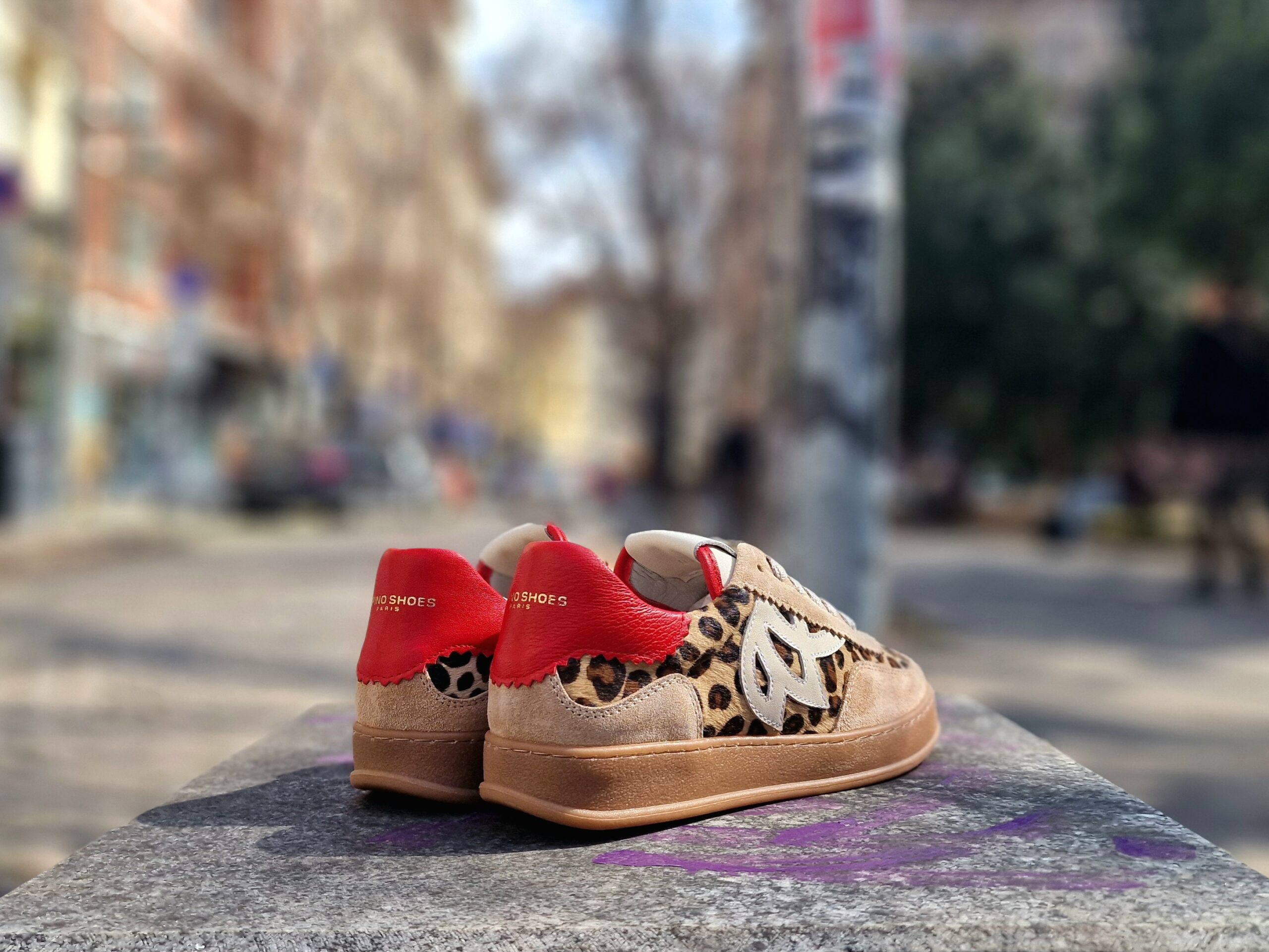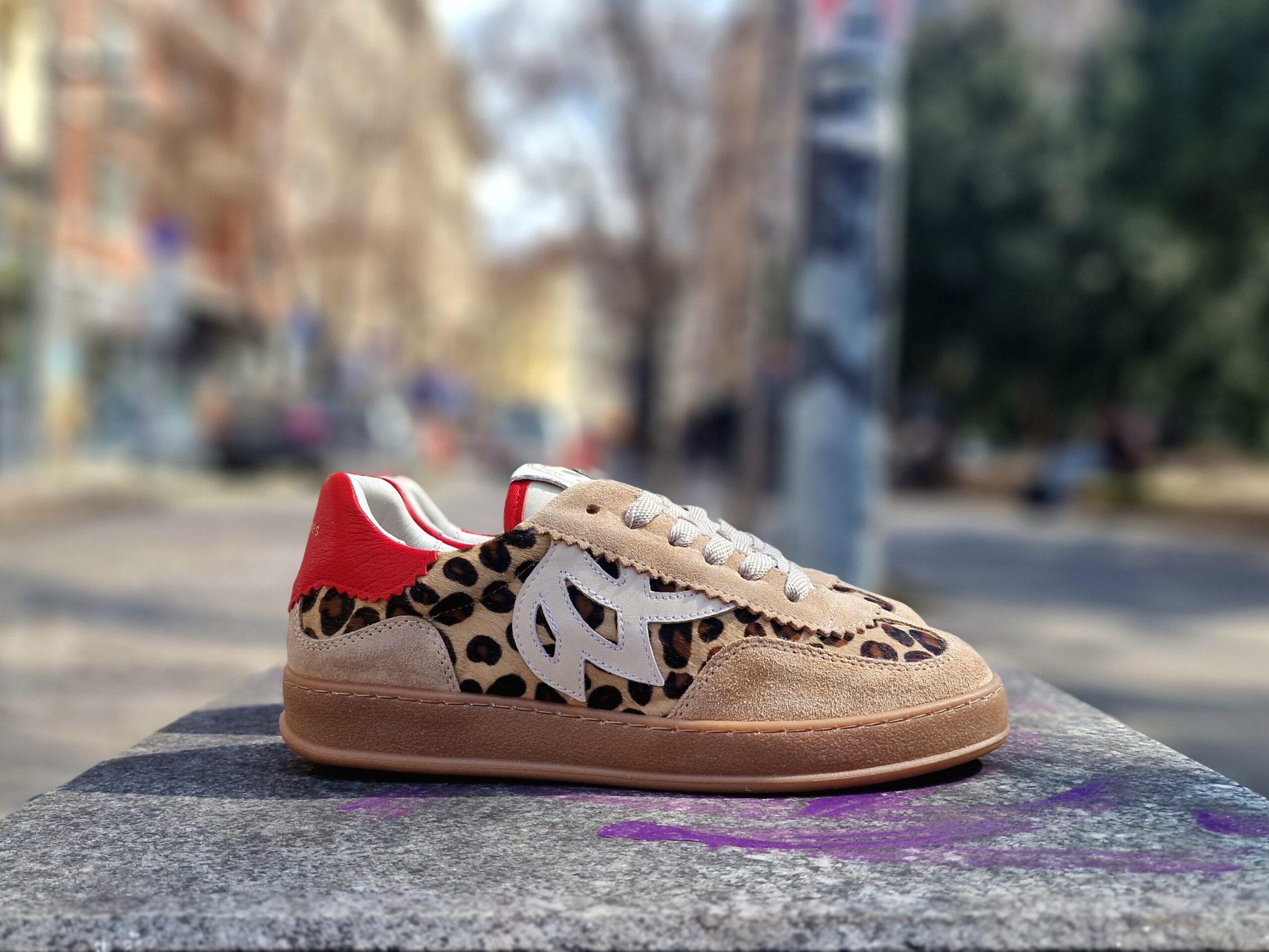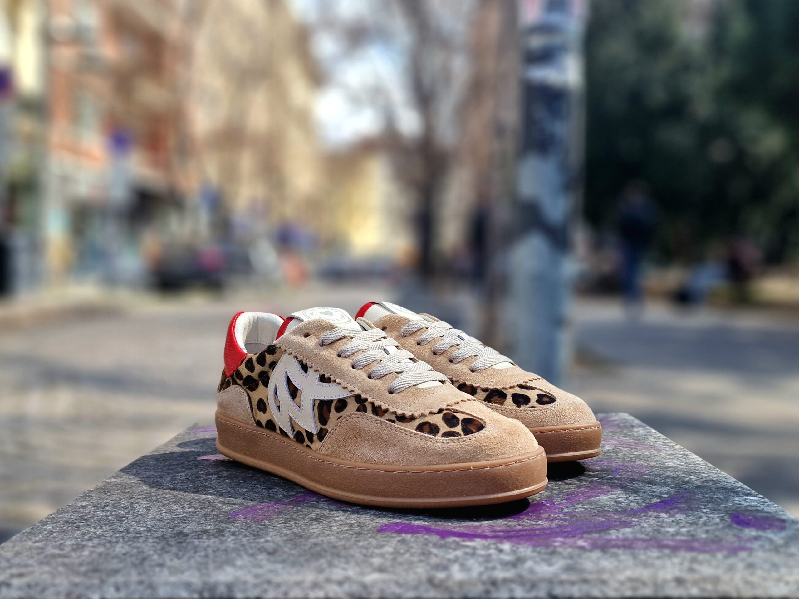Ефектни дамски кецове, съчетаващи нежен бежов велур с дързък леопардов принт от естествена кожа. Моделът впечатлява с червен акцент на петата и бяло дизайнерско лого. Изключително здрави благодарение на шитото и лепено ходило от суров каучук. Перфектният избор за градска визия, която съчетава комфорт и стил. Височина на ходилото: 2.8 см при петата и 2 см при пръстите.
