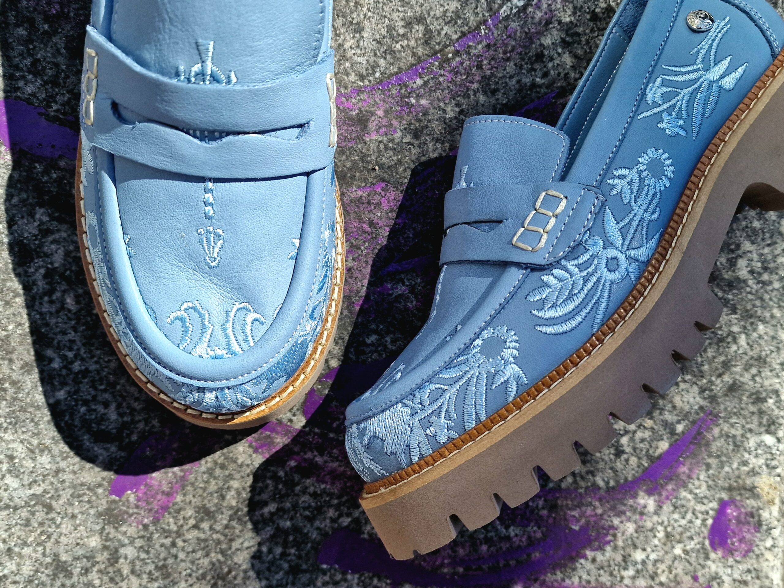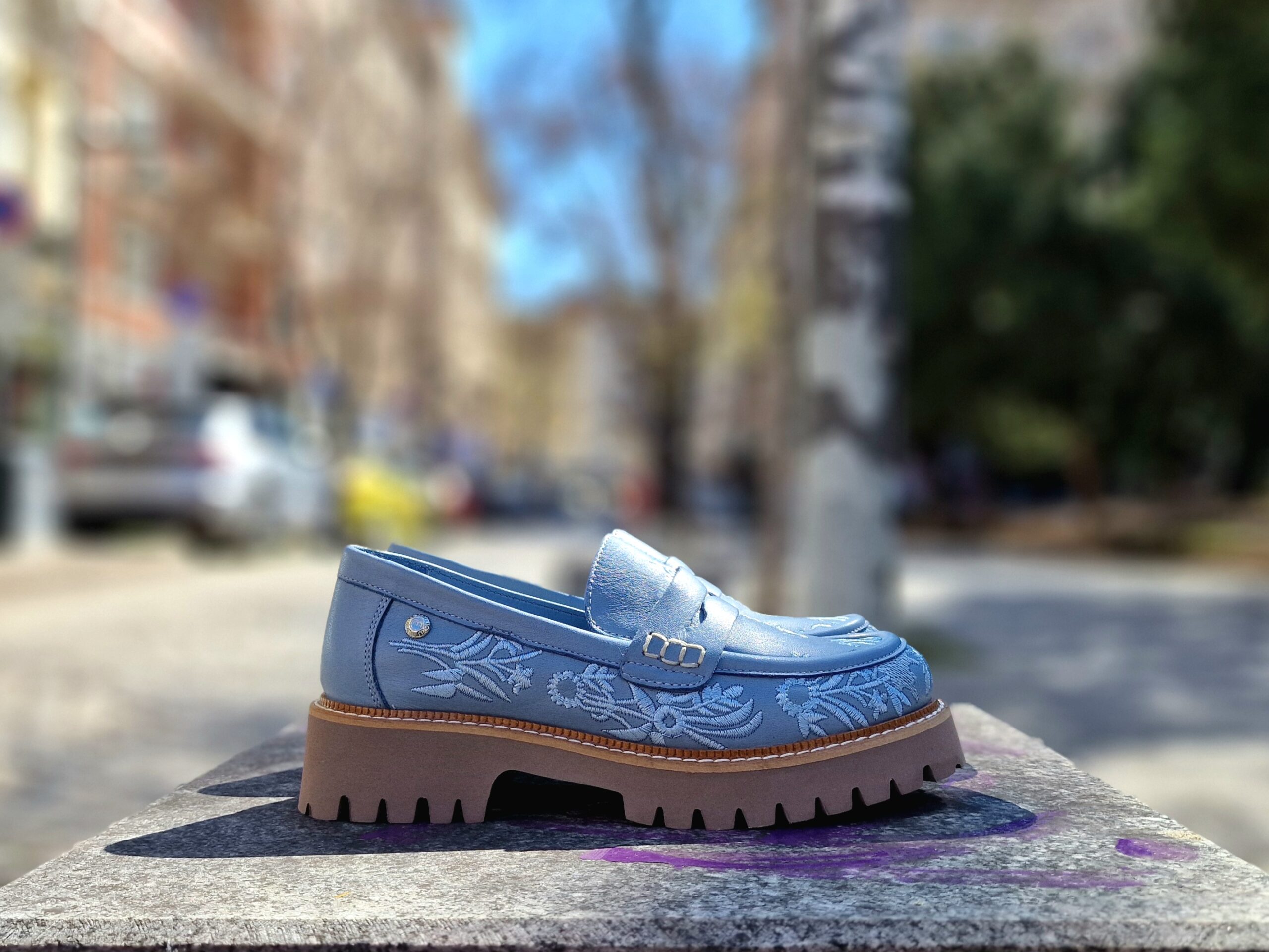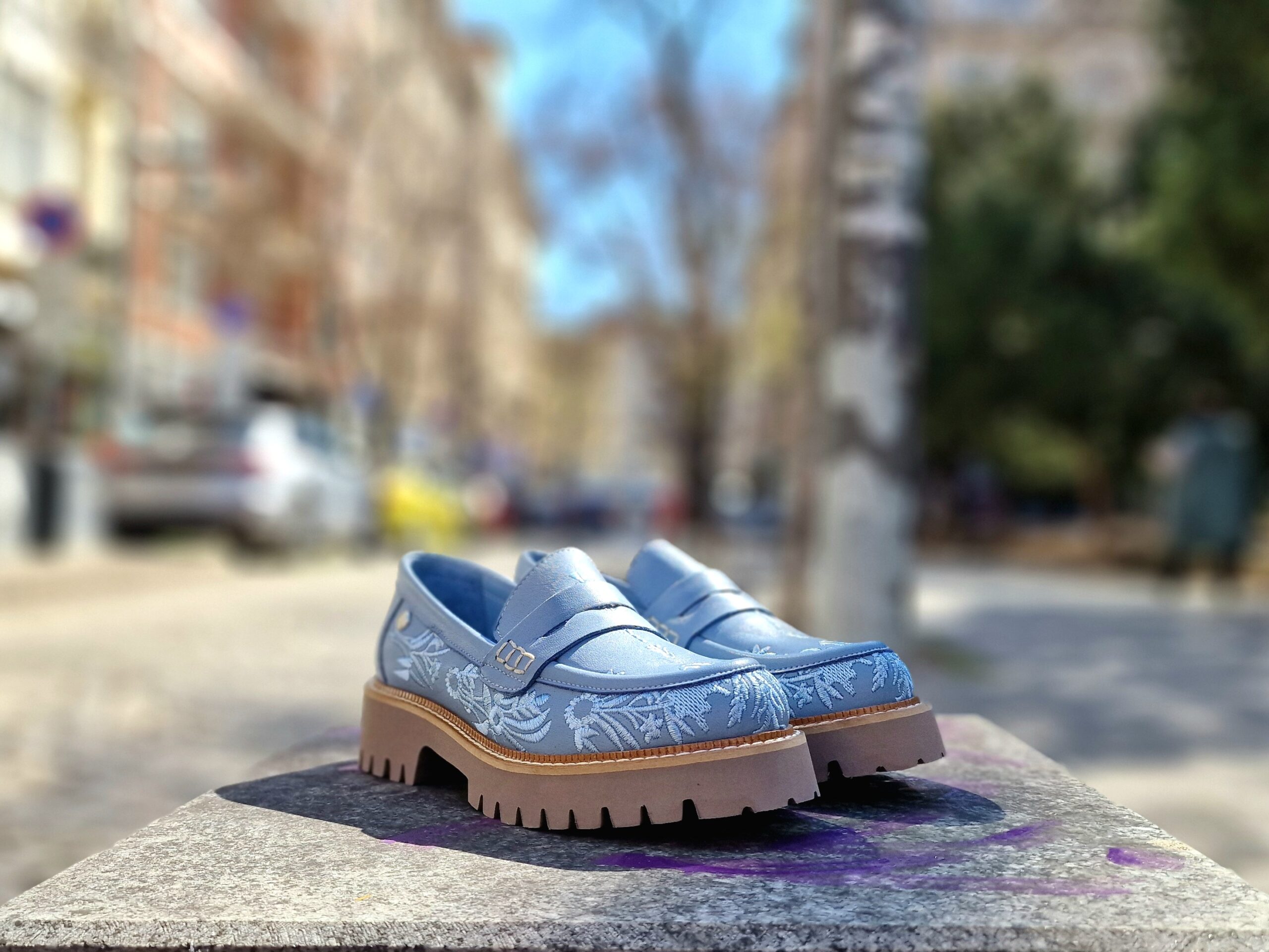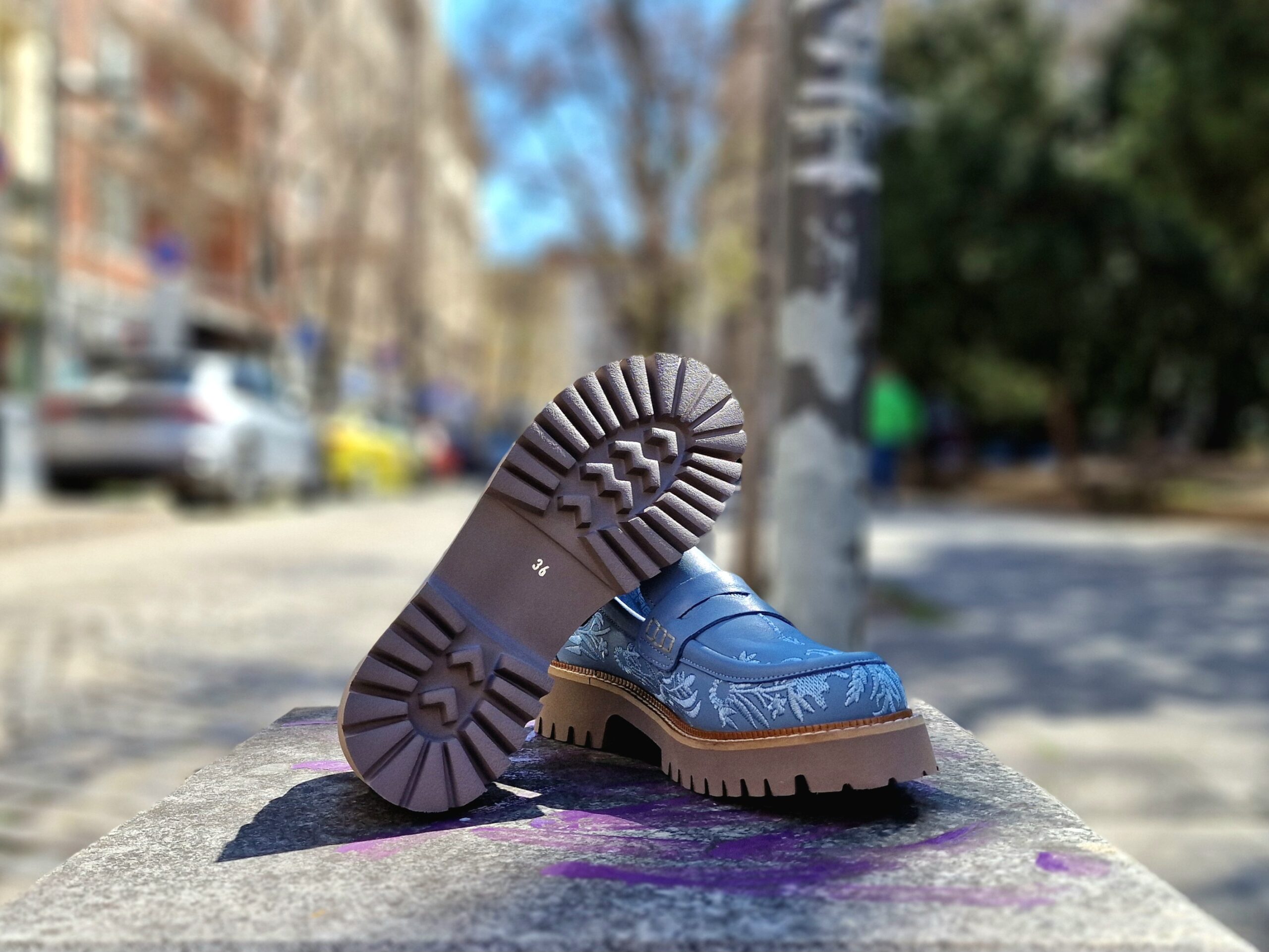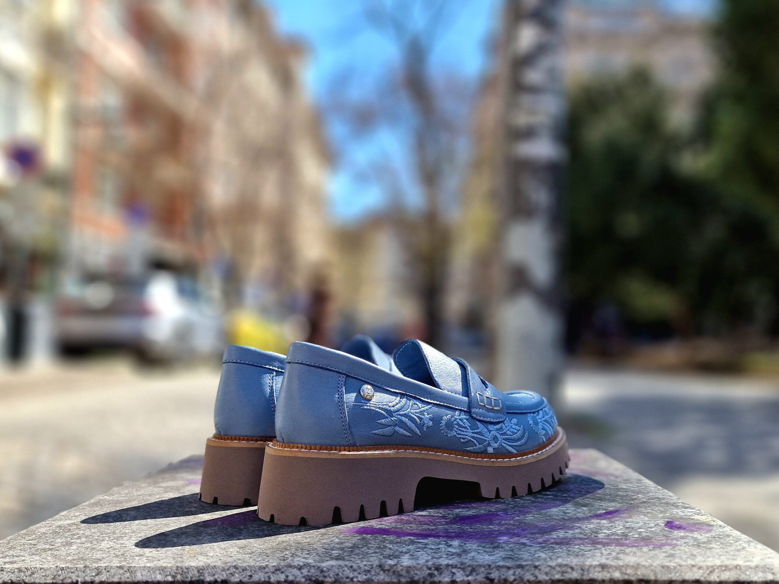 - Лицева част: 100% естествена кожа в небесносин нюанс с прецизно изработена бродерия.
